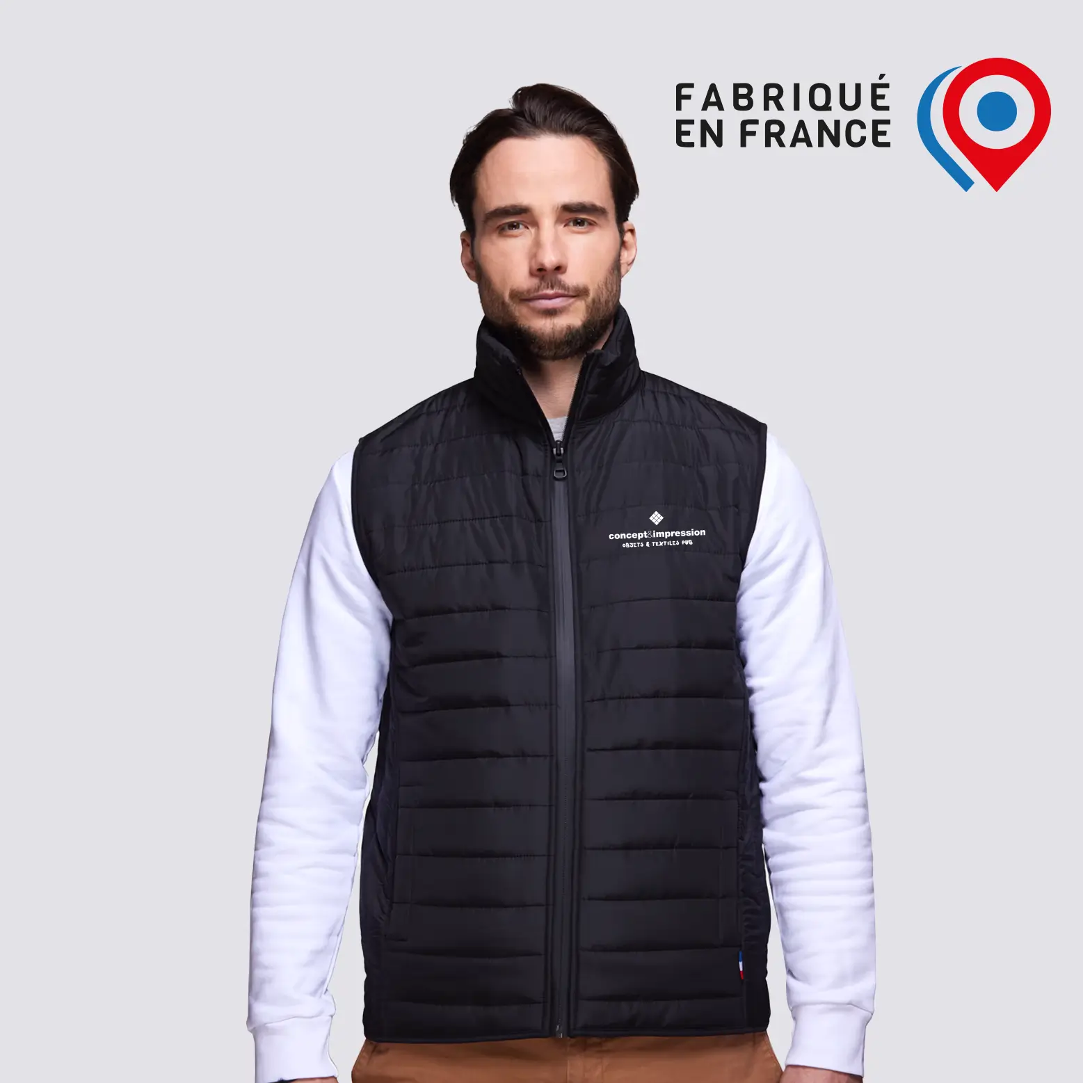 Doudoune sans manches Homme fabriqué en France. Coupe droite. Extérieur en polyester dont 30% de polyester recyclé, garnissage vegan en polyester. Matelassage fin. Coupe droite. Poches mains passepoilées. 2 poches intérieures plaquées. Zip central YKK imperméable.
